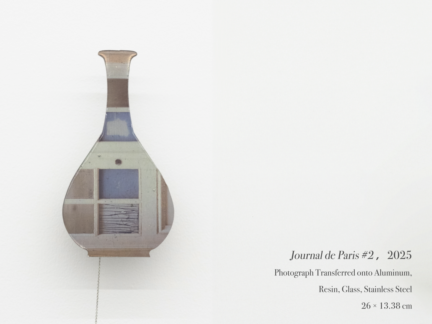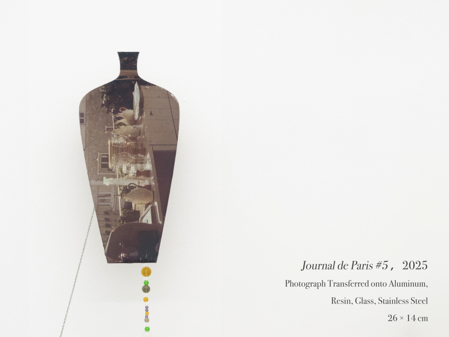 2025The Journal de Paris series continues my exploration of the relationship between images and material form. In this body of work, fragments of photographs taken between 2019 and 2023 on the streets of Paris are transferred onto aluminum panels and linked together with glass beads and stainless-steel chains. The outlines of “a vase” serve as structural motifs, allowing familiar and abstract elements to coexist in a state of tension, forming a visual diary of self-editing and reconstruction.