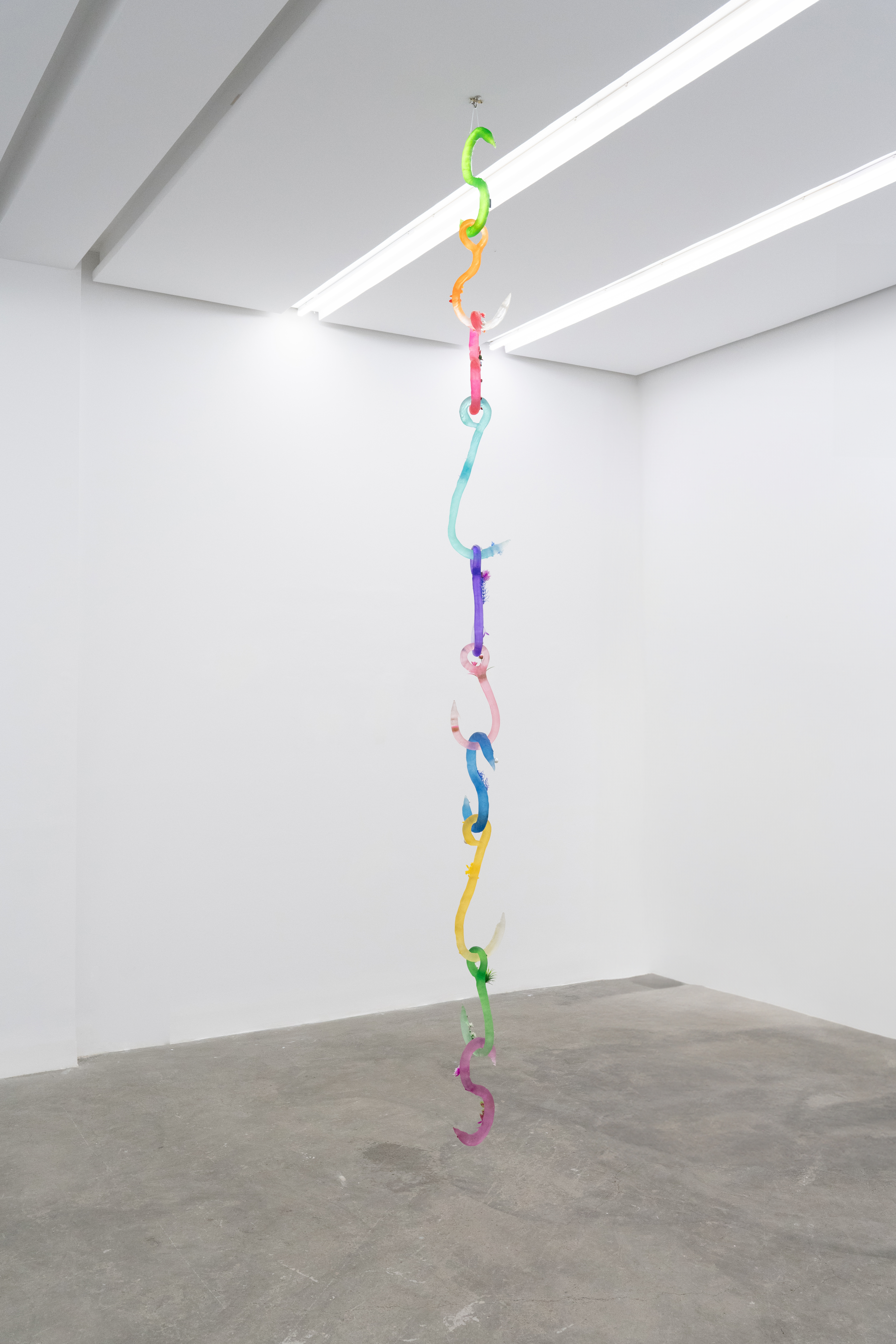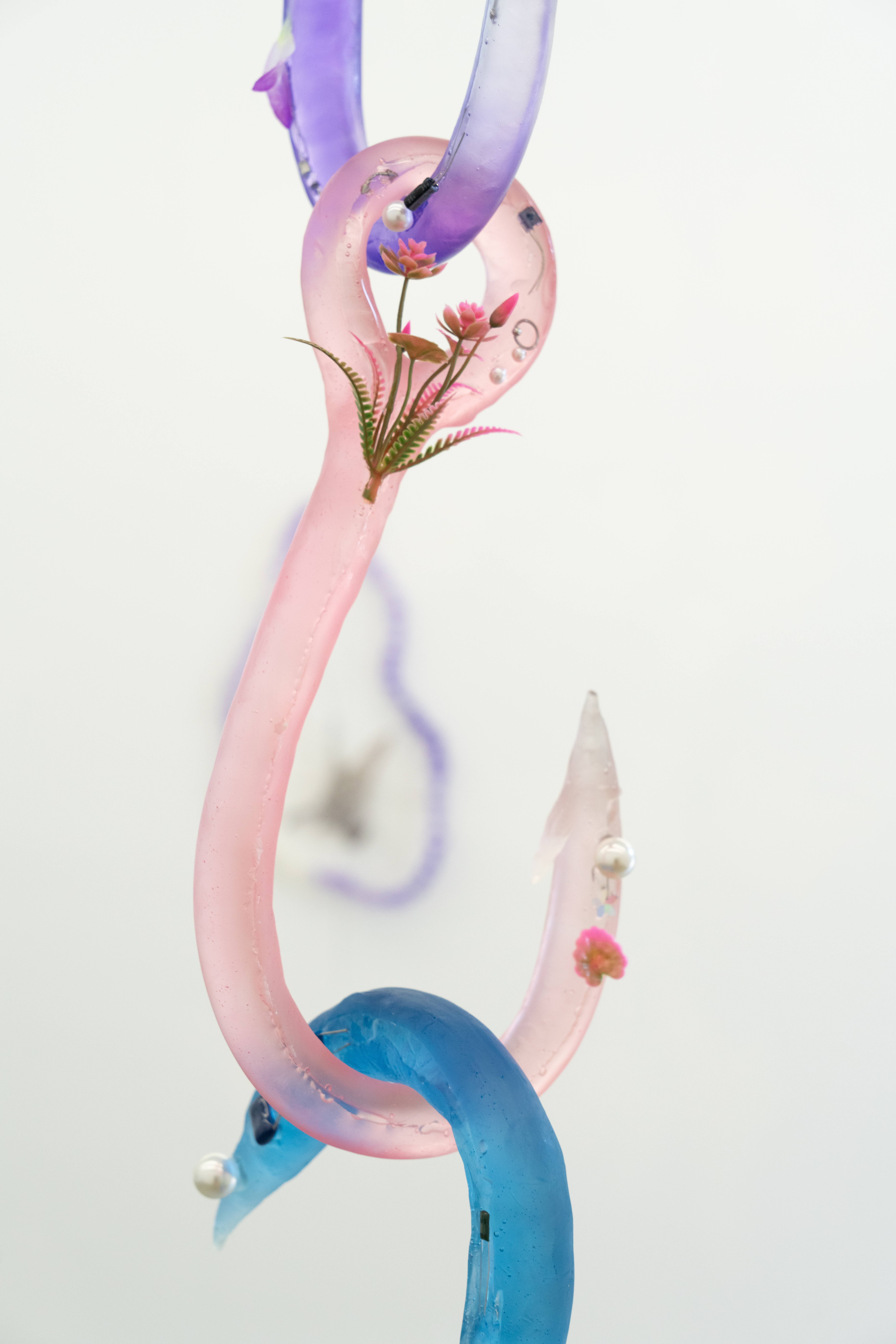 In my reinterpretation of Psyche Revived by Cupid’s Kiss, I reconstruct the classical narrative of love through resin, stainless-steel chains, and piercing rings. The structural logic of puncture – connection – suspension serves both as a physical strategy and a symbolic system. It speaks not of romantic love, but of the universal tensions that bind things together — attraction, entanglement, inseparability. This work reflects on love as a force field, a relational condition that extends beyond human emotion into the dynamics between bodies, objects, and space.