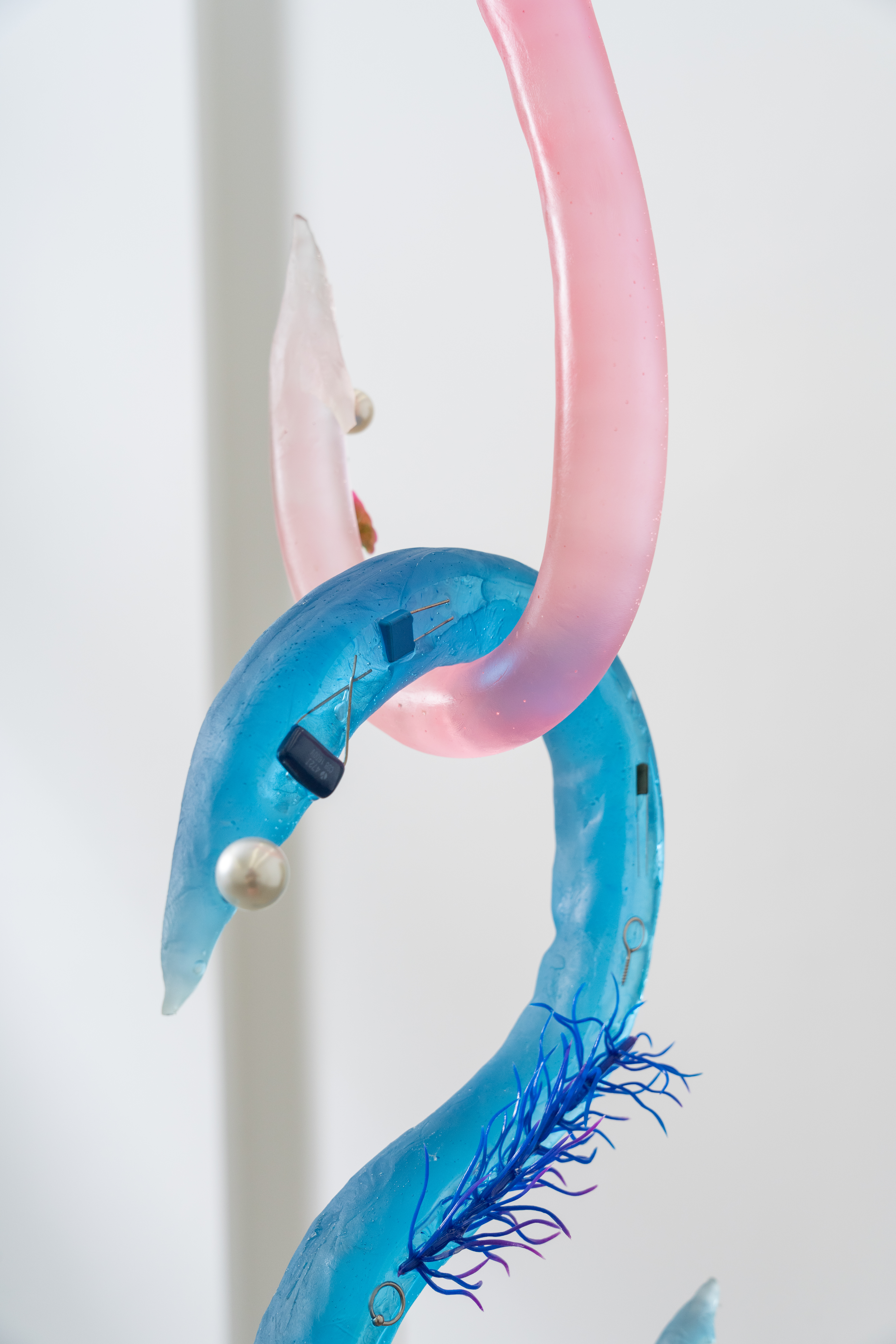 In the Amber of the Everyday works, fishhooks are sealed within resin; their original function of piercing and capturing is suspended. Once instruments of harm, they now intertwine gently, forming structures of dispersed and converging forces. Within this transparent “contemporary amber,” I embed diodes, artificial plants, imitation pearls, and piercing rings. objects that simulate nature yet belong entirely to artificial systems. These sculptures explore a state of “bionic failure,” where imitation becomes its own ecology.