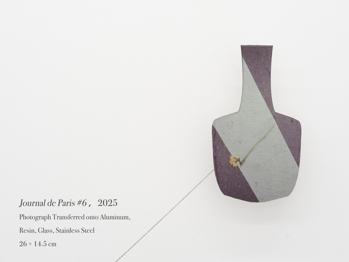 Some materials and techniques new to me also make their debut in this solo exhibition. In the Journal de Paris series and Edge, Undone, I have transferred fragments of images taken between 2019 and 2023 on the streets of Paris, in the deserts of New Mexico, and in the anonymous jungles of Pennsylvania onto aluminum panels, featuring the outlines of a "vase" and a "razor blade," and strung them together with glass beads and stainless steel chains. These images, captured on the streets of Paris, are reimagined on the aluminum panels, forming a visual diary of self-editing through the juxtaposition of familiar and abstract elements.