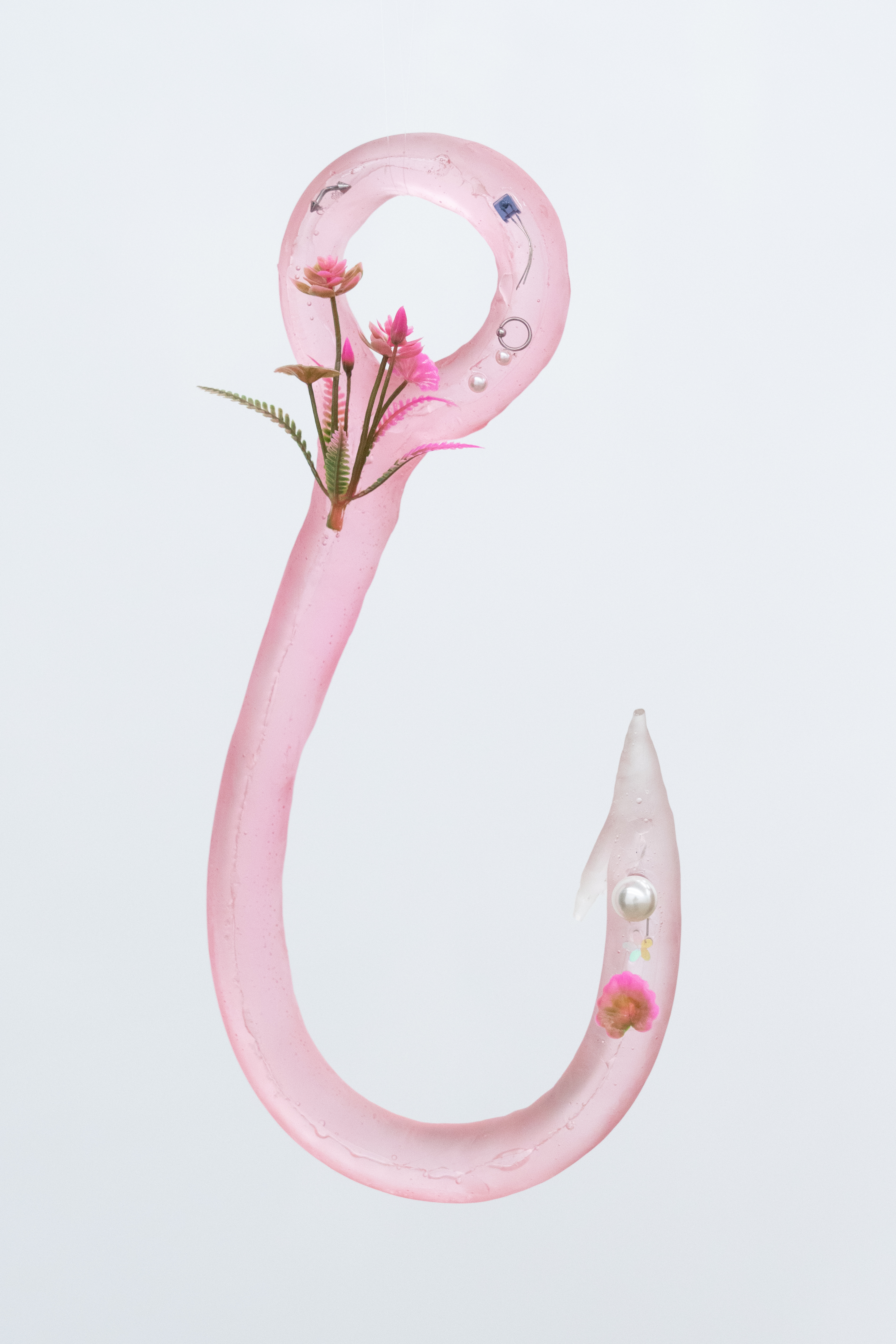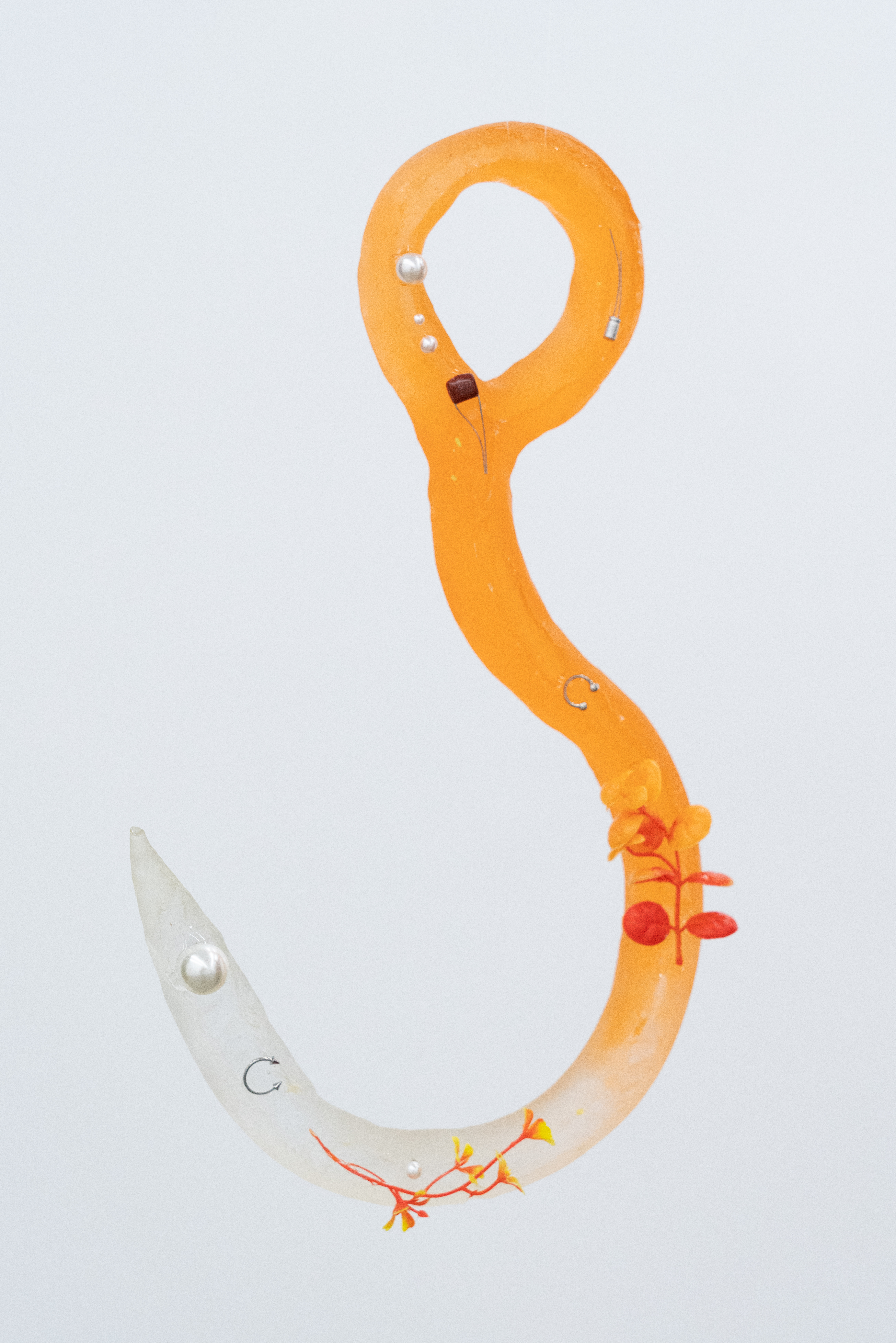 In these "contemporary amber hooks", I have embedded diodes, artificial plants, artificial pearls, and piercing rings—typical artifacts that imitate nature, mimicking not only its forms but also its mechanisms of existence. This "bionic-failure" mechanism represents a hallmark of contemporary man-made nature: nature is no longer the imitated other, but the produced nature—a constantly evolving structure of images that is designed, coded, and encapsulated. Piercing, as an act of bodily intervention, is also understood here as a conscious rupture with "naturalness."