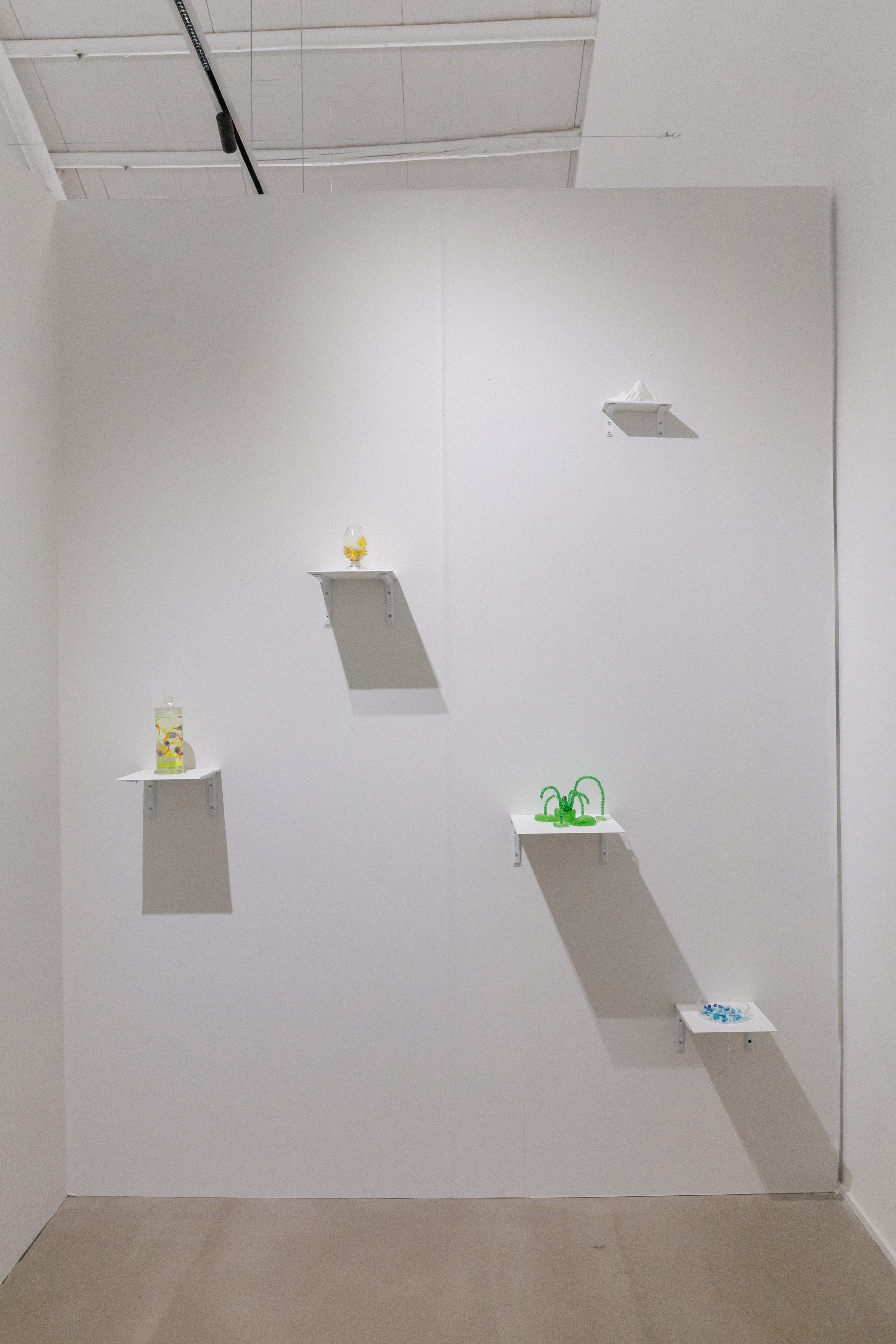 In the corner of the exhibition is a small room. Five fictional specimens are placed inside, and five folded cards with text are on the opposite wall in the corresponding positions.